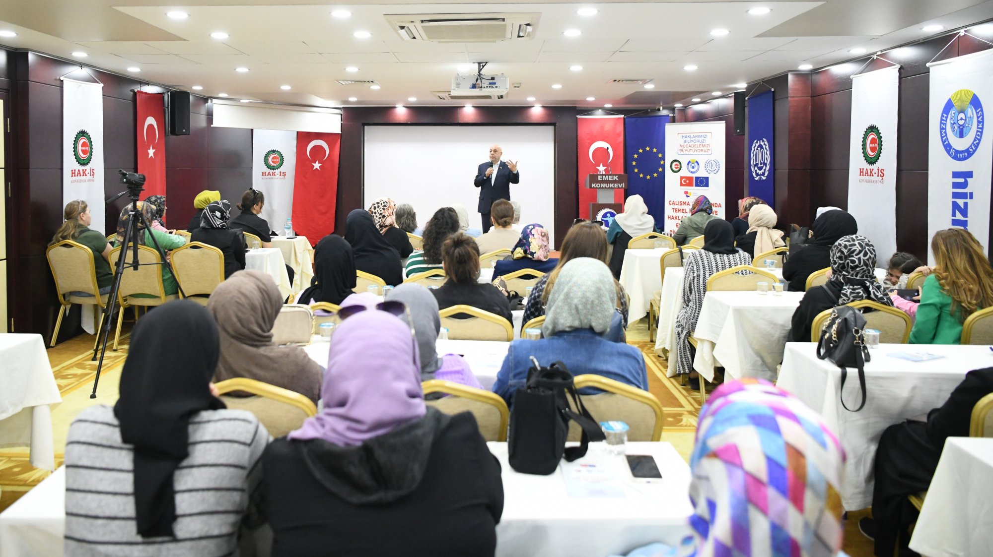 Emek Konukevi’nde gerçekleştirilen programa Genel Başkanımız Arslan’ın yanı sıra; Hizmet-İş Sendikamızın Kadın Komite Başkanı ve Proje Koordinatörü Hatice Ayhan, Kadın Komite Başkan Yardımcısı Arzu Tekin, Hizmet-İş Ankara Şube Kadın Komite Başkan ve Yardımcıları, Toplu iş sözleşmesi Daire Uzmanları Dr. Sefa Karagöz, Tansu Göksu ve Asalettin Yıldız ile ev işçileri üyelerimiz katıldı.