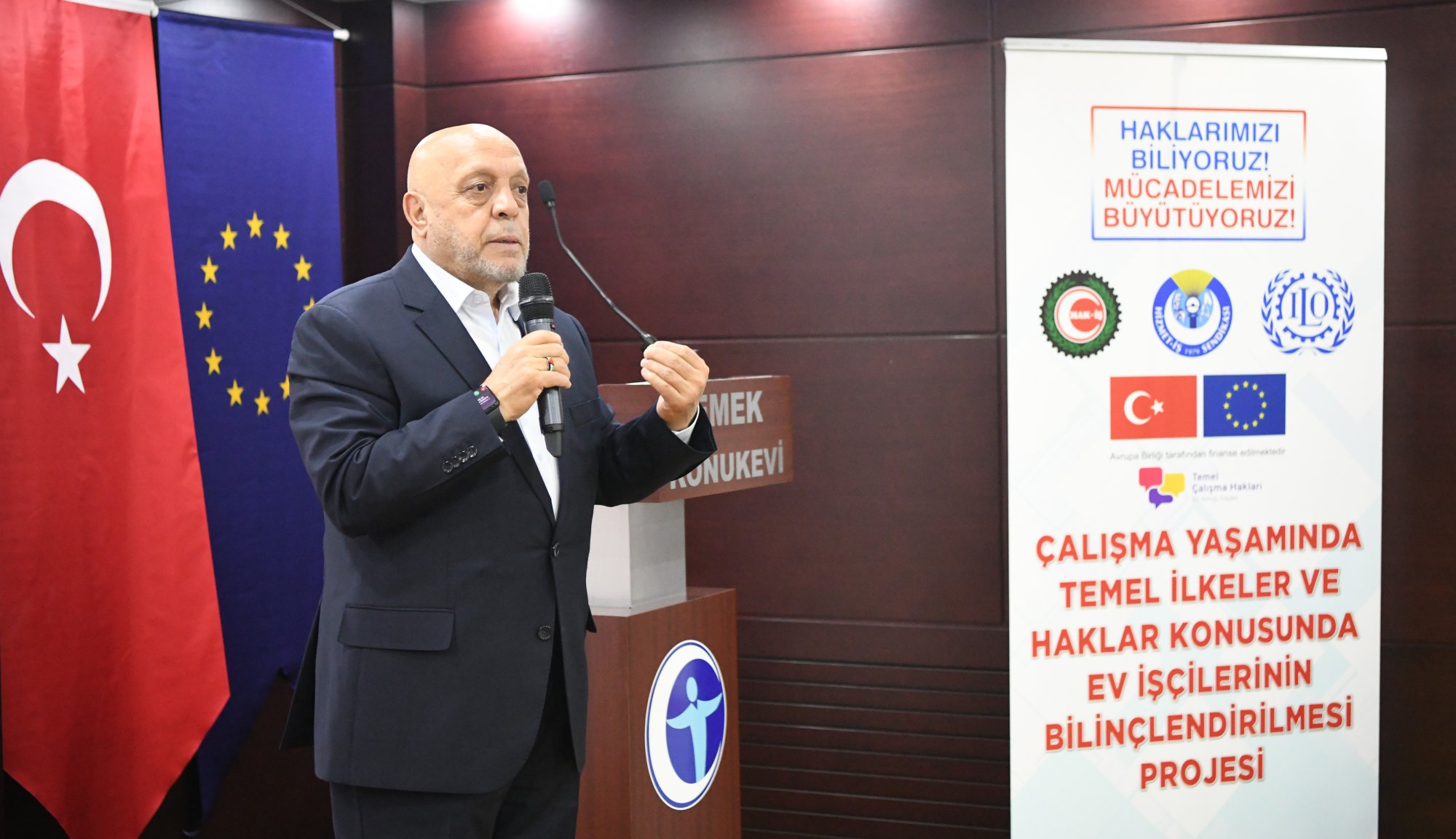 Genel Başkanımız Mahmut Arslan, 7 Mayıs 2025 tarihinde, Avrupa Birliği (AB) tarafından finanse edilen Uluslararası Çalışma Örgütü (ILO) tarafından desteklenen Hizmet-İş Sendikamızın ‘Çalışma Yaşamında Temel İlkeler ve Haklar Konusunda Ev İşçilerinin Bilinçlendirilmesi’ eğitim programına katıldı.
