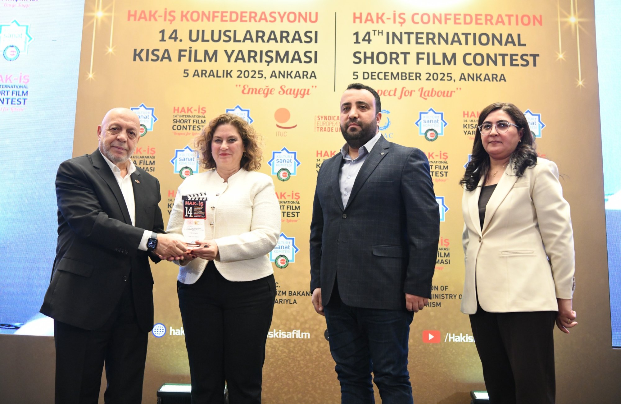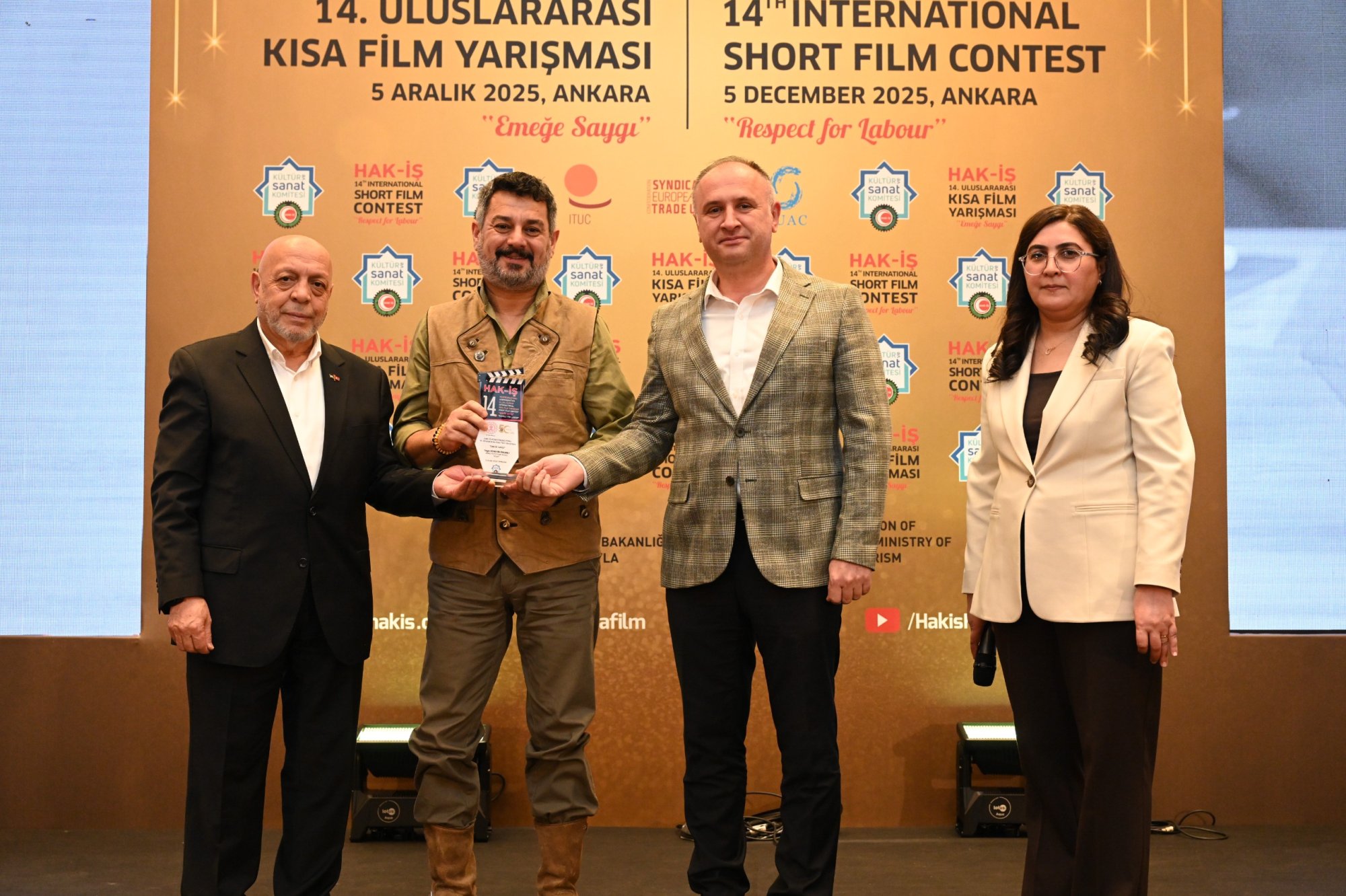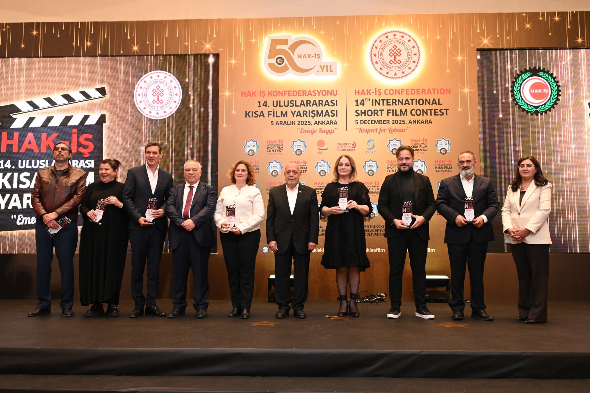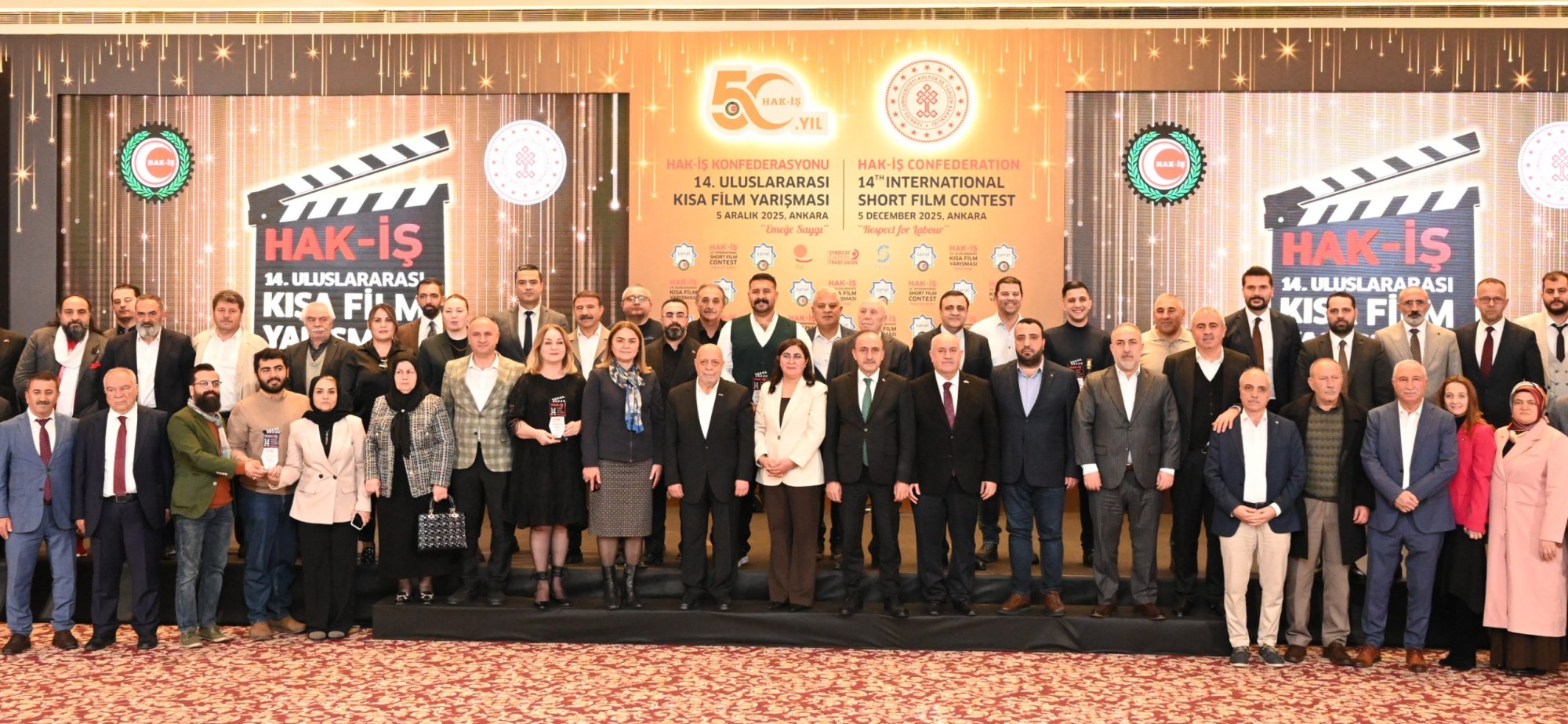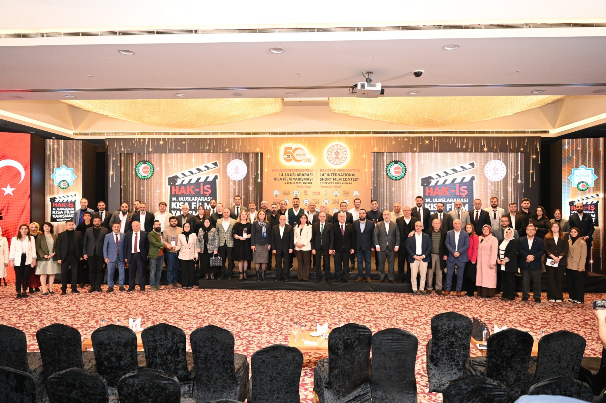 HAK-İŞ 14. Uluslararası Kısa Film Yarışması ödül töreni 5 Aralık 2025 tarihinde Ankara’da gerçekleştirildi. Törene, Genel Başkanımız Mahmut Arslan’ın yanı sıra, Genel Başkan Yardımcılarımız Devlet Sert ve Halil Özdemir, Genel Sekreterimiz Eda Akbulut, Genel Sekreter Yardımcımız Fatma Zengin, HAK-İŞ Kültür ve Sanat Komitesi Başkanımız Birsen Çiçek Odabaşı, Sinema Genel Müdürlüğü Daire Başkanı Bilge Kılıç Çakır, İyi Parti STK Başkan Yardımcısı Elif Loğoğlu, Azerbaycan Ankara Büyükelçiliği Kültür Müsteşarı Samir Abbasov, Memur-Sen Genel Başkan Yardımcısı Hamza Öksüz, Türkiye Gaziler ve Şehit Aileleri Vakfı Başkanı Lokman Aylar, üye sendikalarımızın genel başkan ve yönetim kurulu üyeleri, sendikalarımızda görev yapan Kültür ve Sanat Komitesi Başkanları, siyasetçiler, sivil toplum kuruluşlarının yöneticileri, akademisyenler, Genel Merkez çalışanlarımız ve basın mensupları katıldı.