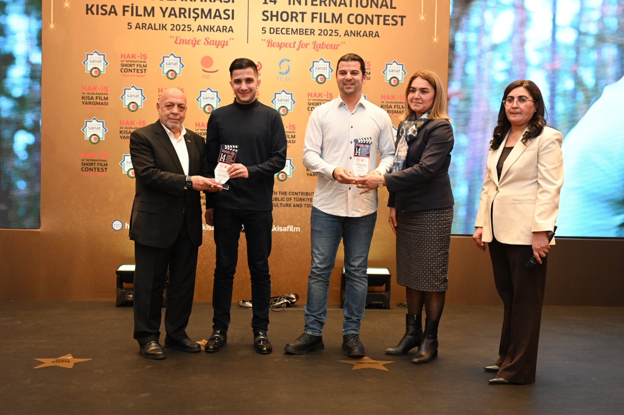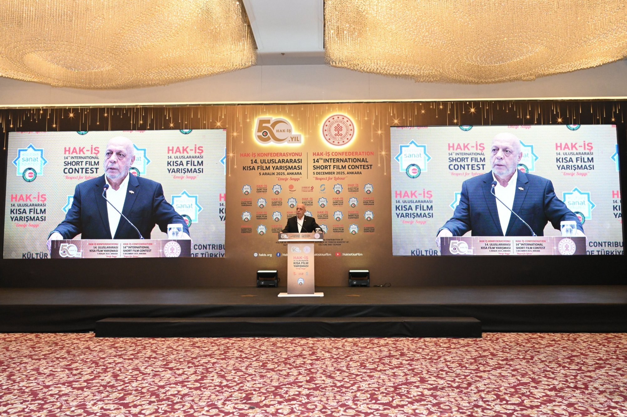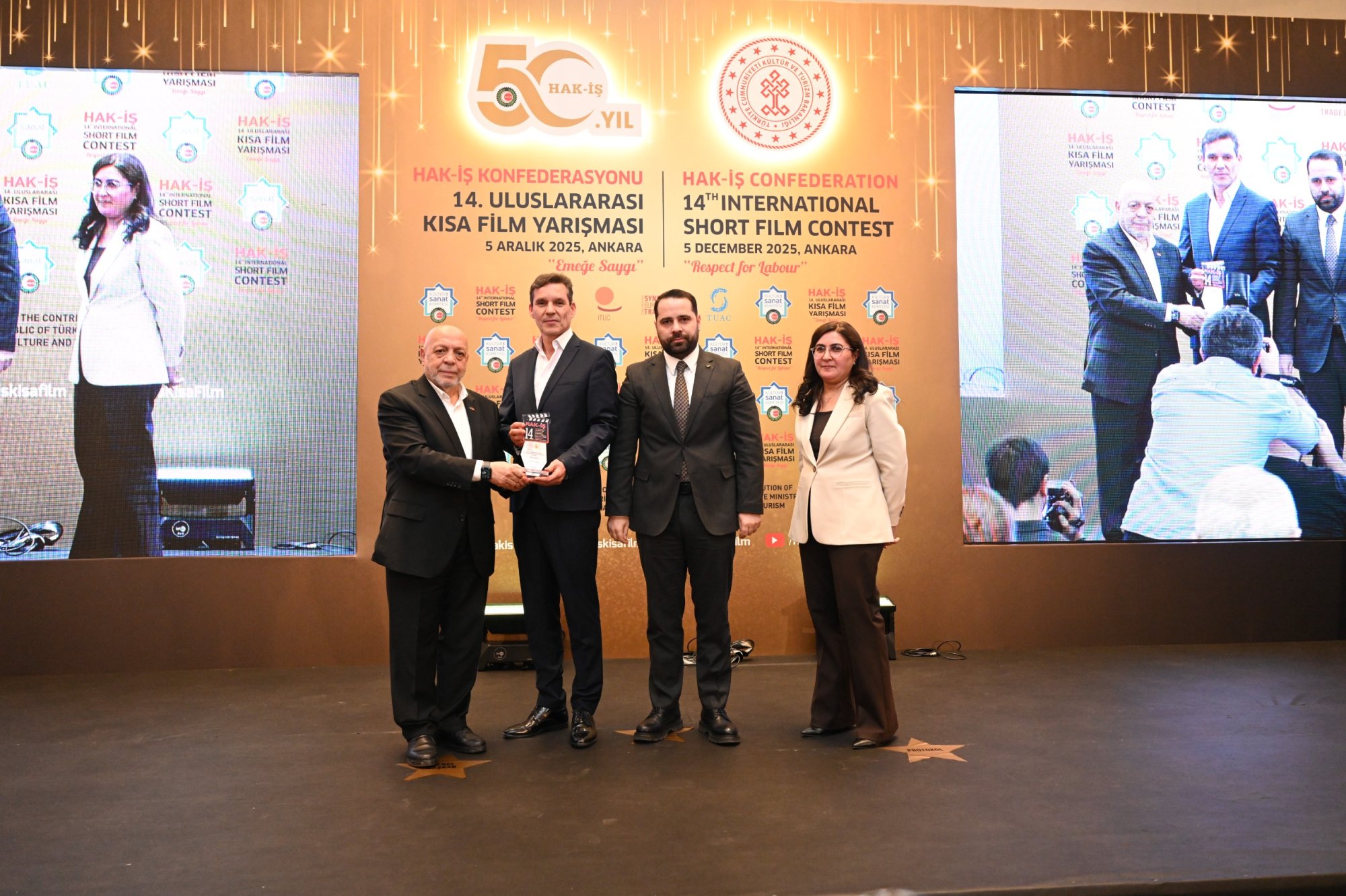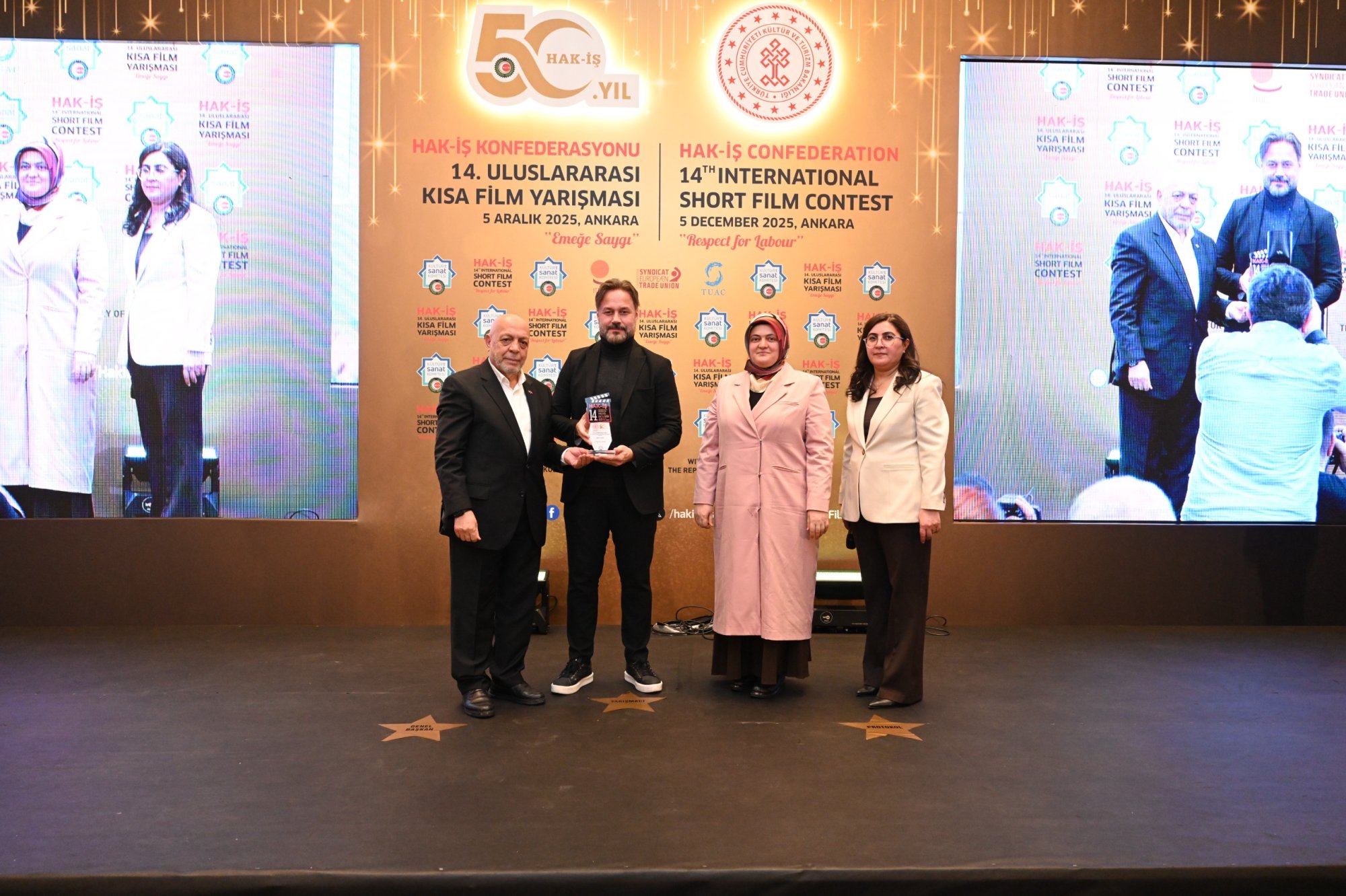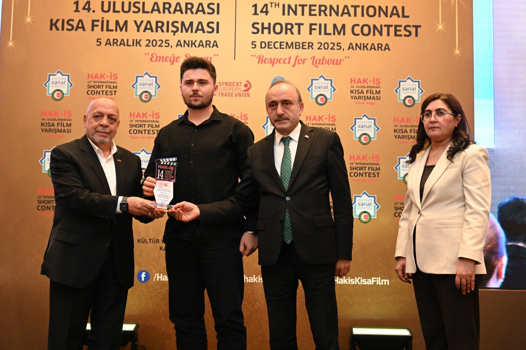 HAK-İŞ 14. Uluslararası Kısa Film Yarışması ödül töreni 5 Aralık 2025 tarihinde Ankara’da gerçekleştirildi. Törene, Genel Başkanımız Mahmut Arslan’ın yanı sıra, Genel Başkan Yardımcılarımız Devlet Sert ve Halil Özdemir, Genel Sekreterimiz Eda Akbulut, Genel Sekreter Yardımcımız Fatma Zengin, HAK-İŞ Kültür ve Sanat Komitesi Başkanımız Birsen Çiçek Odabaşı, Sinema Genel Müdürlüğü Daire Başkanı Bilge Kılıç Çakır, İyi Parti STK Başkan Yardımcısı Elif Loğoğlu, Azerbaycan Ankara Büyükelçiliği Kültür Müsteşarı Samir Abbasov, Memur-Sen Genel Başkan Yardımcısı Hamza Öksüz, Türkiye Gaziler ve Şehit Aileleri Vakfı Başkanı Lokman Aylar, üye sendikalarımızın genel başkan ve yönetim kurulu üyeleri, sendikalarımızda görev yapan Kültür ve Sanat Komitesi Başkanları, siyasetçiler, sivil toplum kuruluşlarının yöneticileri, akademisyenler, Genel Merkez çalışanlarımız ve basın mensupları katıldı.