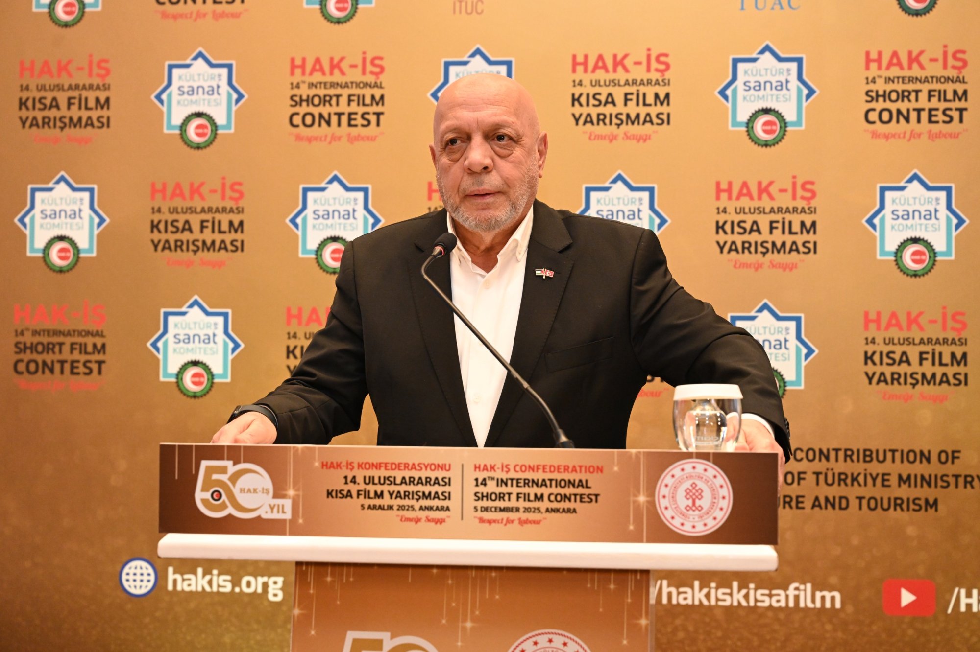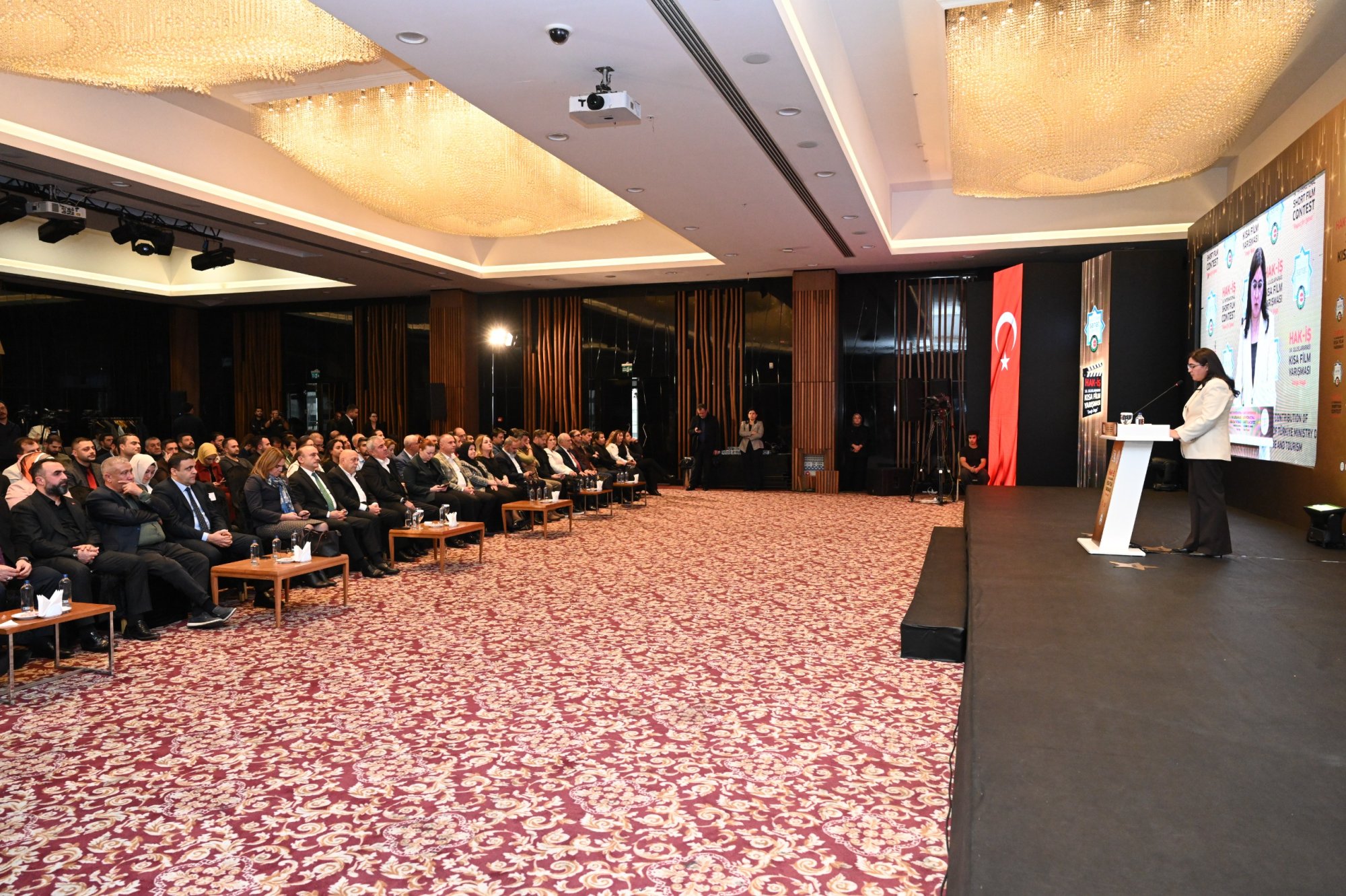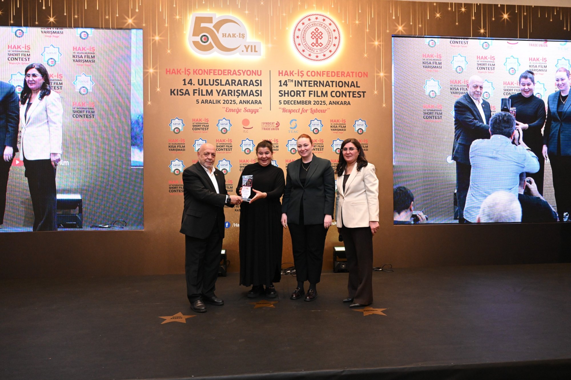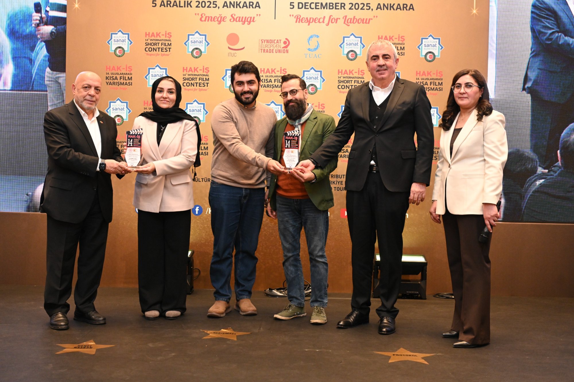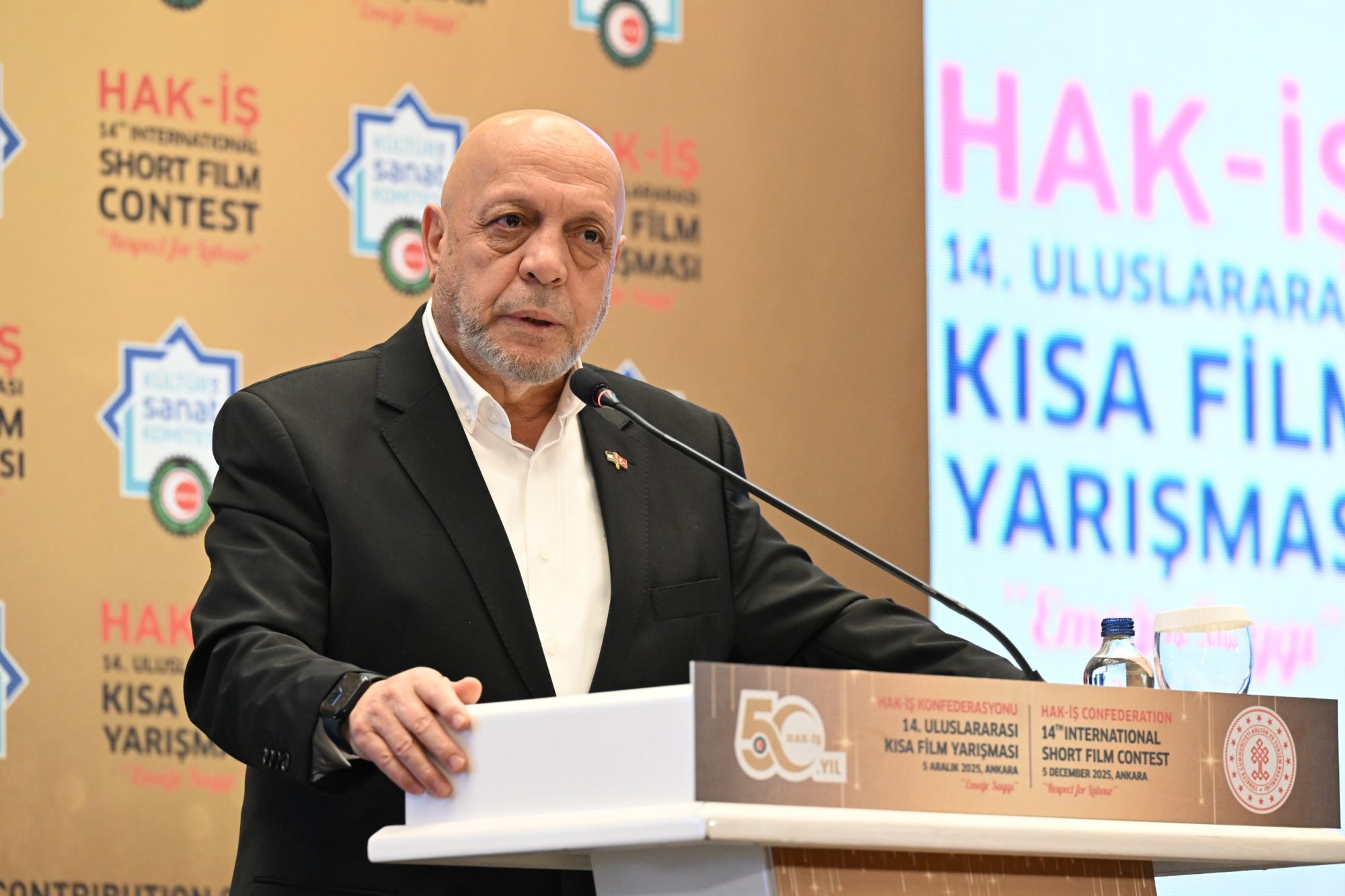 HAK-İŞ 14. Uluslararası Kısa Film Yarışması ödül töreni 5 Aralık 2025 tarihinde Ankara’da gerçekleştirildi. Törene, Genel Başkanımız Mahmut Arslan’ın yanı sıra, Genel Başkan Yardımcılarımız Devlet Sert ve Halil Özdemir, Genel Sekreterimiz Eda Akbulut, Genel Sekreter Yardımcımız Fatma Zengin, HAK-İŞ Kültür ve Sanat Komitesi Başkanımız Birsen Çiçek Odabaşı, Sinema Genel Müdürlüğü Daire Başkanı Bilge Kılıç Çakır, İyi Parti STK Başkan Yardımcısı Elif Loğoğlu, Azerbaycan Ankara Büyükelçiliği Kültür Müsteşarı Samir Abbasov, Memur-Sen Genel Başkan Yardımcısı Hamza Öksüz, Türkiye Gaziler ve Şehit Aileleri Vakfı Başkanı Lokman Aylar, üye sendikalarımızın genel başkan ve yönetim kurulu üyeleri, sendikalarımızda görev yapan Kültür ve Sanat Komitesi Başkanları, siyasetçiler, sivil toplum kuruluşlarının yöneticileri, akademisyenler, Genel Merkez çalışanlarımız ve basın mensupları katıldı.