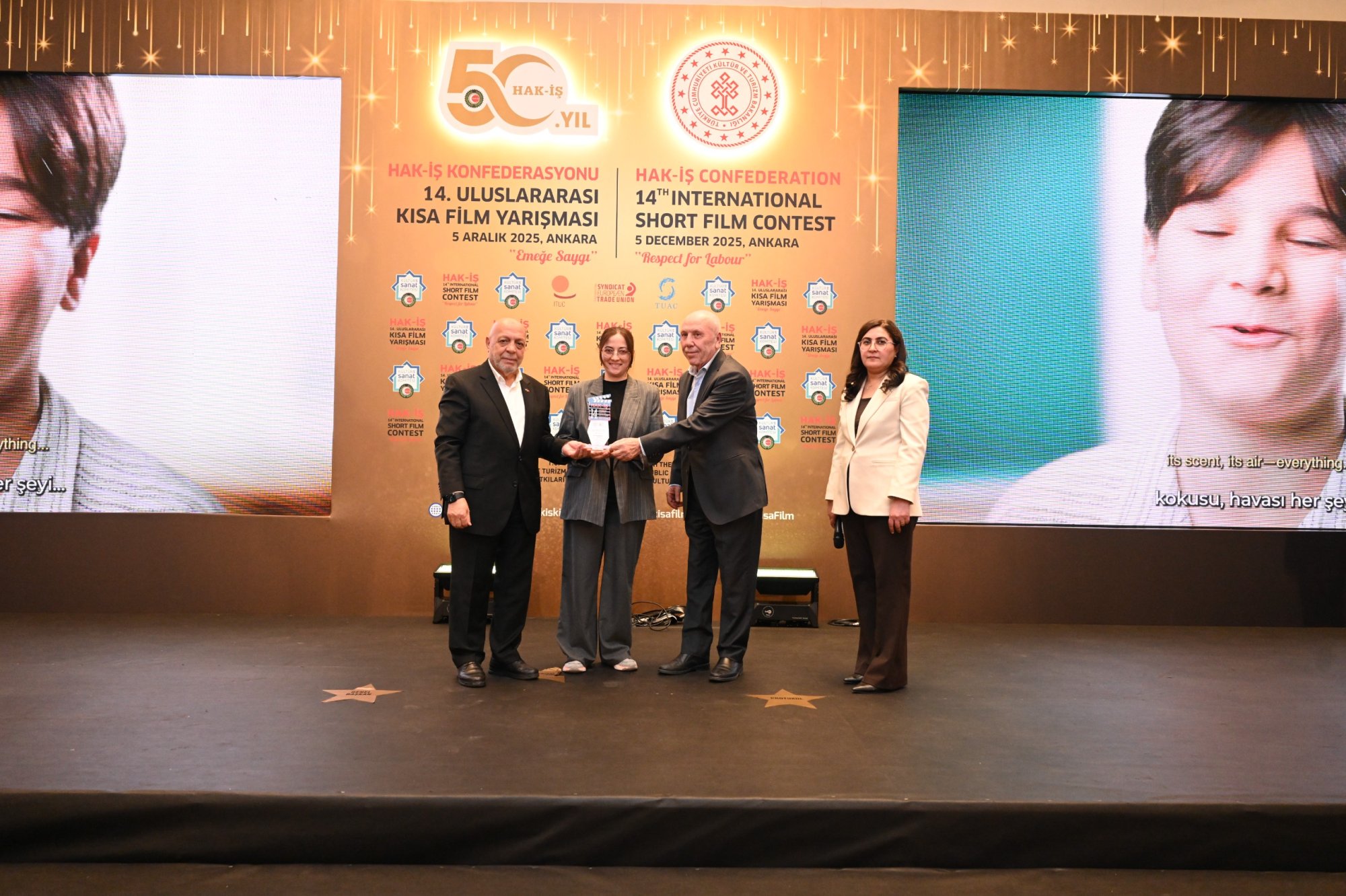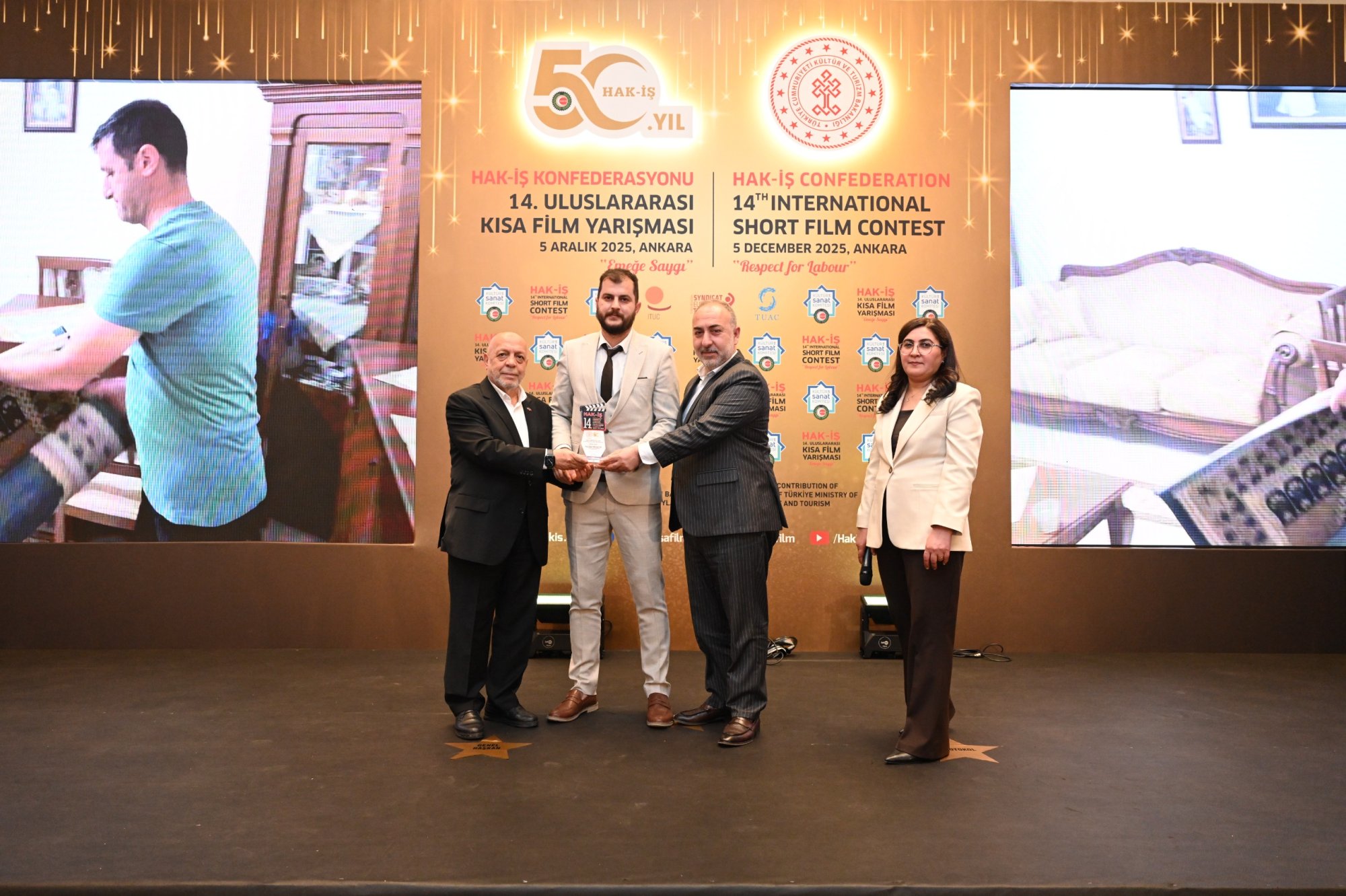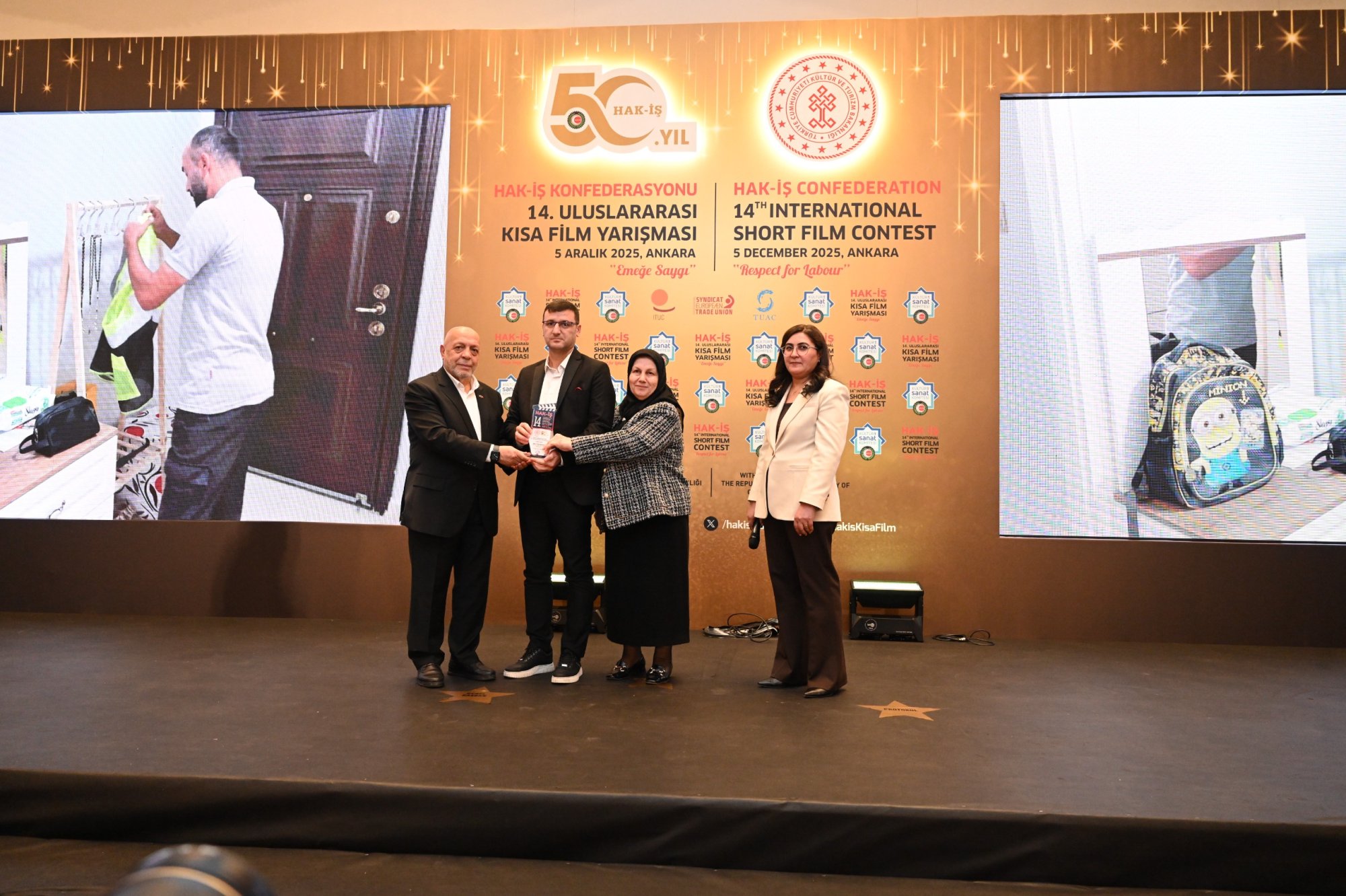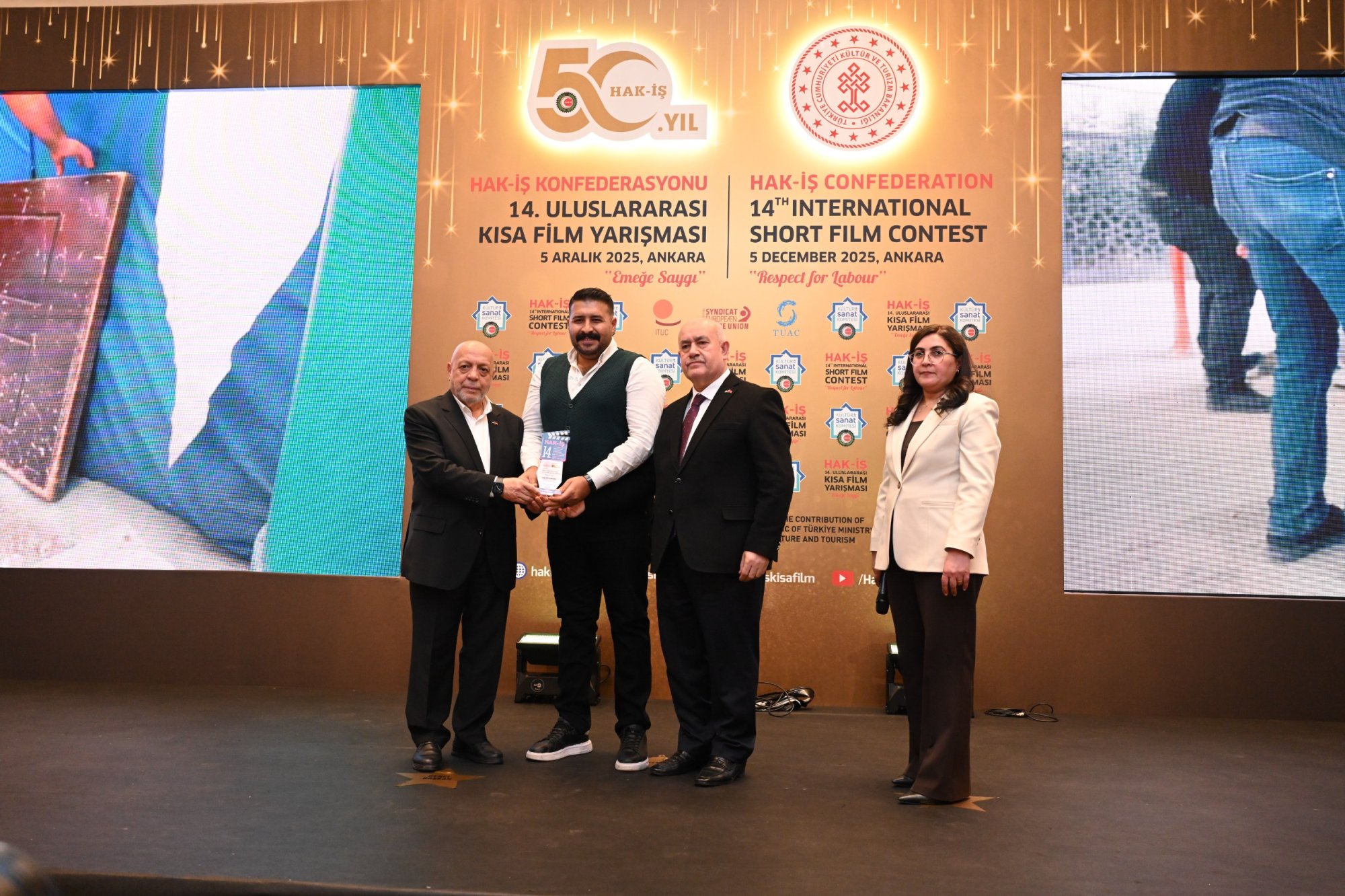 Kültür ve Turizm Bakanlığımızın katkılarıyla uluslararası alanda gerçekleştirilen ve HAK-İŞ’in 50 yıllık emek ve mücadele yolculuğunun kültürel alandaki önemli adımlarından biri olan HAK-İŞ 14. Uluslararası Kısa Film Yarışması ödülleri, sahiplerini buldu.