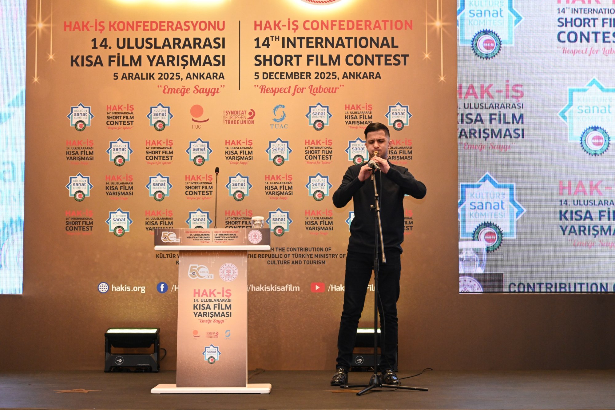 Saygı duruşu ve İstiklal Marşı'nın okunmasıyla başlayan programda, Konfederasyonumuz HAK-İŞ’in 50. Kuruluş yılı için hazırlanan özel film ve HAK-İŞ Kısa Film Yarışması tanıtım filmi izlendi. Ardından, şair ve oyuncu Dursun Ali Erzincanlı "40 yaşındasın" şiirini okudu. Azerbaycanlı balaban sanatçısı Nijat Masimov da müzik dinletisi sundu.