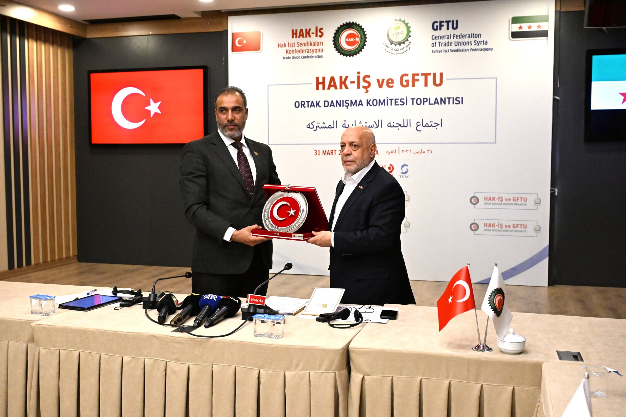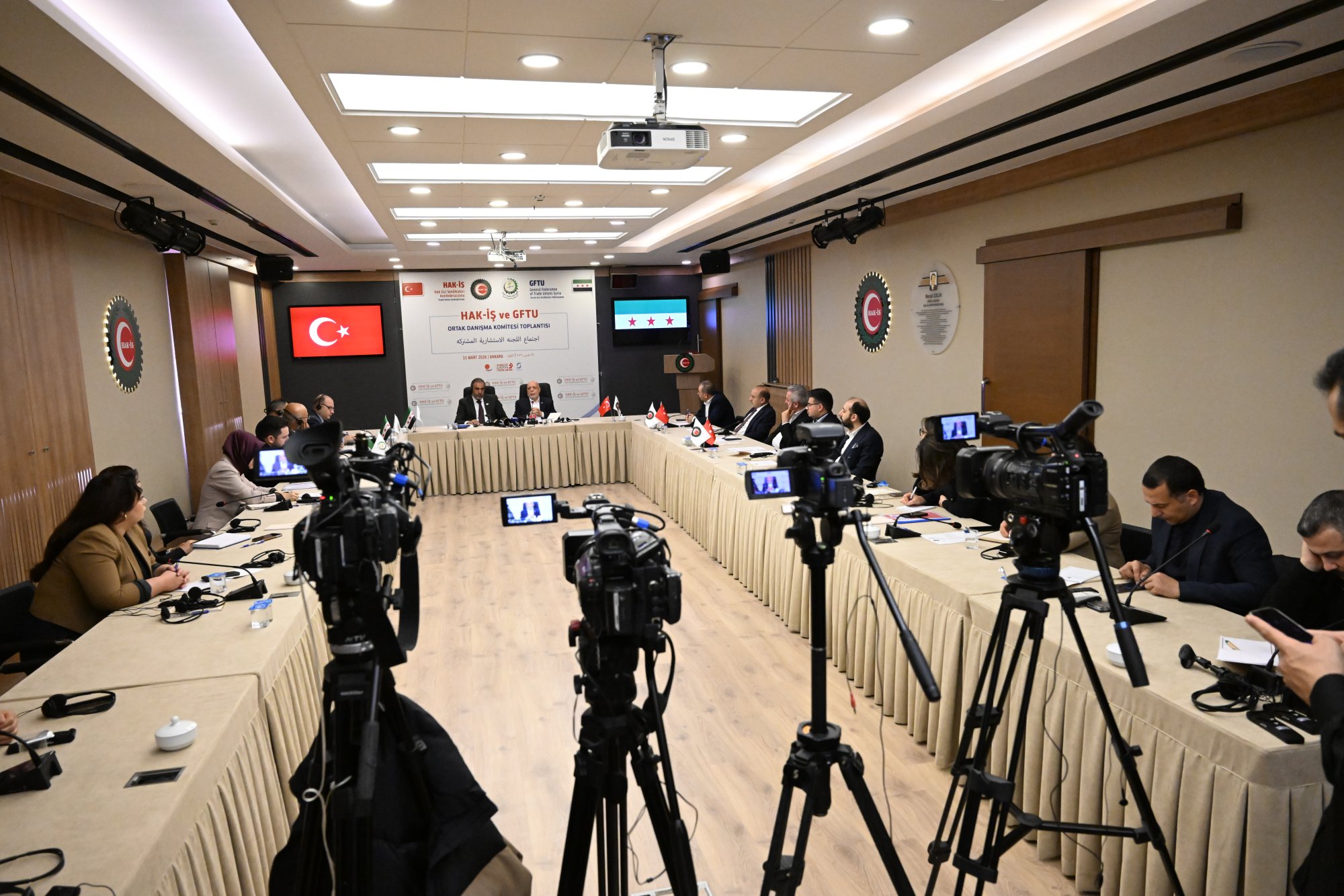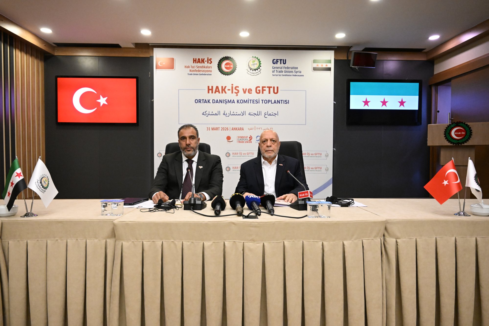 HAK-İŞ ve Suriye İşçi Sendikaları Federasyonu (GFTU) Ortak Danışma Komite Toplantısı, 31 Mart 2026 tarihinde Genel Başkanımız Mahmut Arslan ve Suriye İşçi Sendikaları Federasyonu (GFTU) Genel Başkanı Fawaz Al-Ahmad’in başkanlığında HAK-İŞ Genel Merkezi’nde gerçekleştirildi.