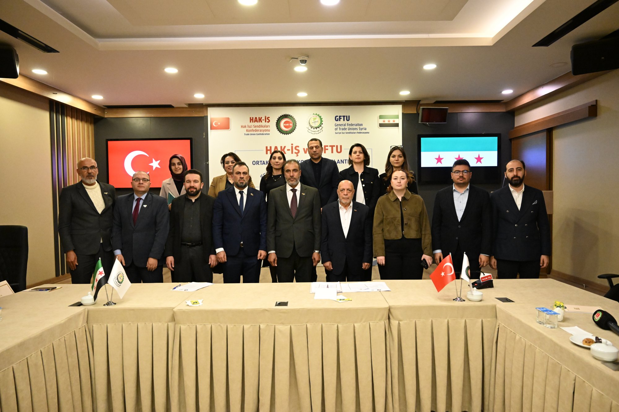 Toplantıya, Genel Başkanımız Mahmut Arslan’ın yanı sıra Genel Başkan Yardımcılarımız; Yunus Değirmenci Devlet Sert ve Halil Özdemir, Genel Sekreterimiz Eda Akbulut, Genel Sekreter Yardımcımız Hamdi Abdullah Koçoğlu, Suriye İşçi Sendikaları Federasyonu (GFTU) Genel Başkanı Fawaz Al-Ahmad, Yönetim Kurulu Üyesi Mohammad Ali Rustum, Tartus İl Başkanı Ahmad Sahyounı, Uluslararası İlişkiler Koordinatörü Adnan Azzouz, ULFED Başkanı Muhammed Akta, uzmanlarımız ve basın mensupları katıldı.